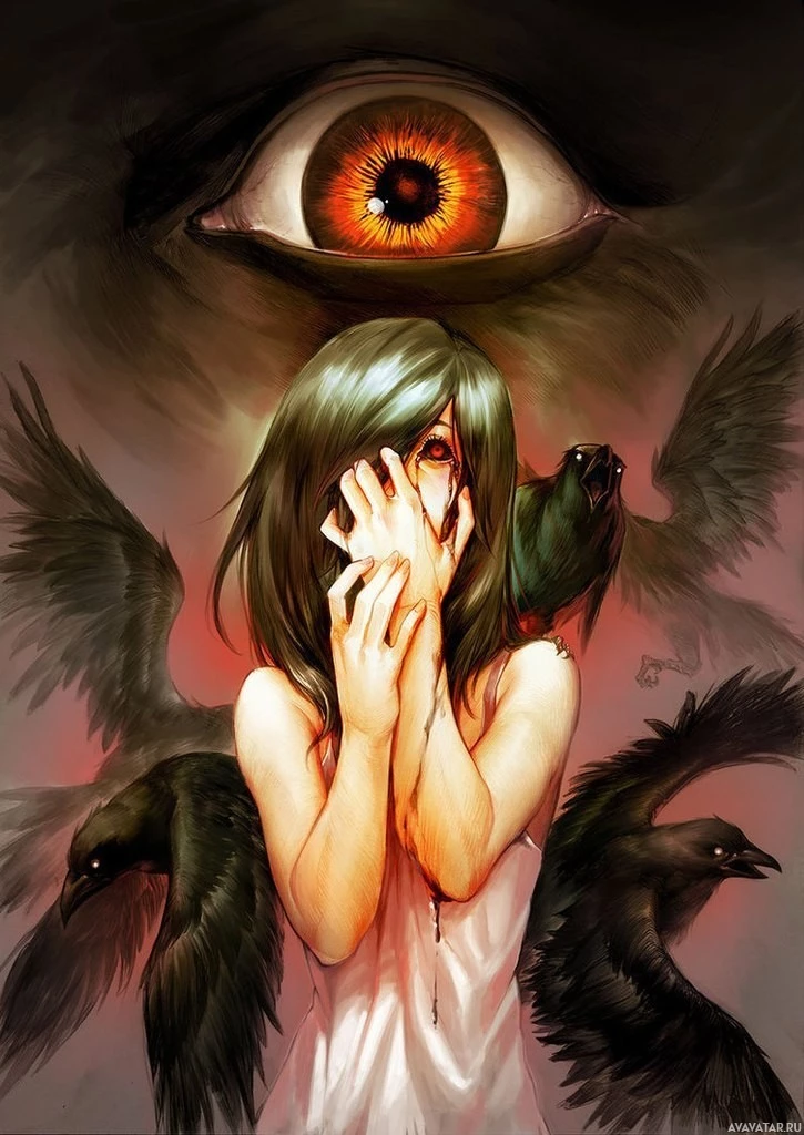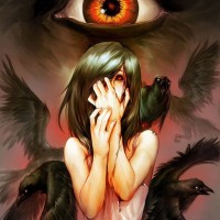 the ominous atmosphere. Behind her is an eye, symbolizing awareness or surveillance, possibly suggesting that she is being watched. The colors are dark and moody, reinforcing