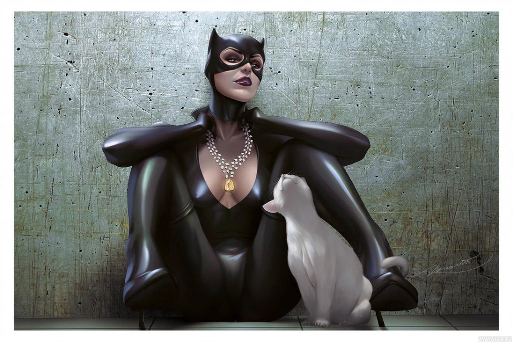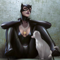 a white cat. Both characters are set against a backdrop that resembles an urban or industrial environment, possibly suggesting a scene from the comics where Catwoman might be found. The style of the artwork is illustrative and detailed, capturing the essence of the character's persona in