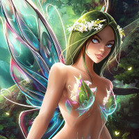 green hair and wings, which are typical characteristics of fairies in fantasy-themed artwork. She is dressed in a flowing garment that suggests a magical or ethereal nature, often associated with