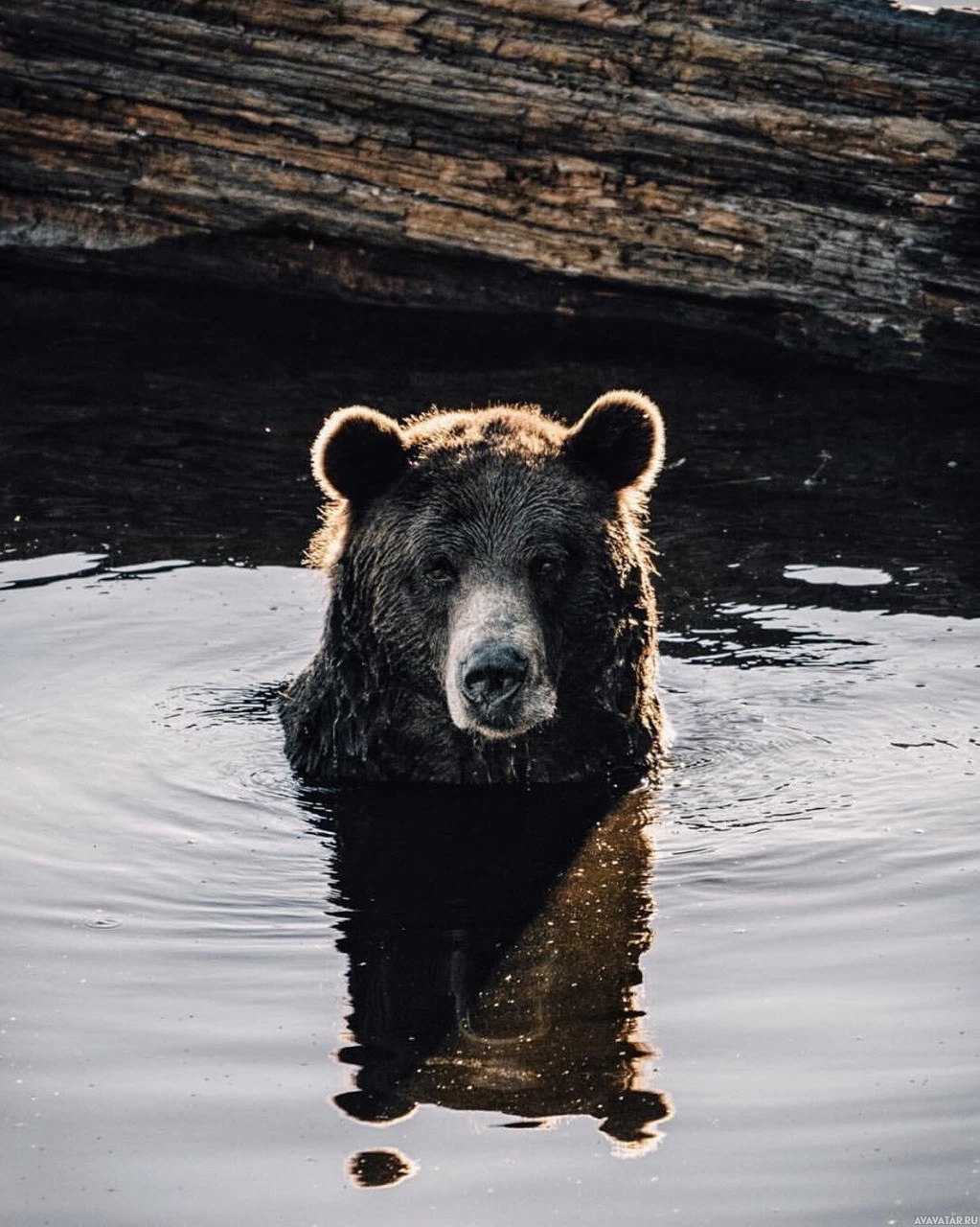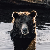 На картинке изображен бурый медведь на мелководье. Кажется, что это солнечный день, о чем свидетельствует мягкое освещение и отражения на поверхности воды. Медведь кажется спокойным, возможно, пробираясь через пруд или ручей.