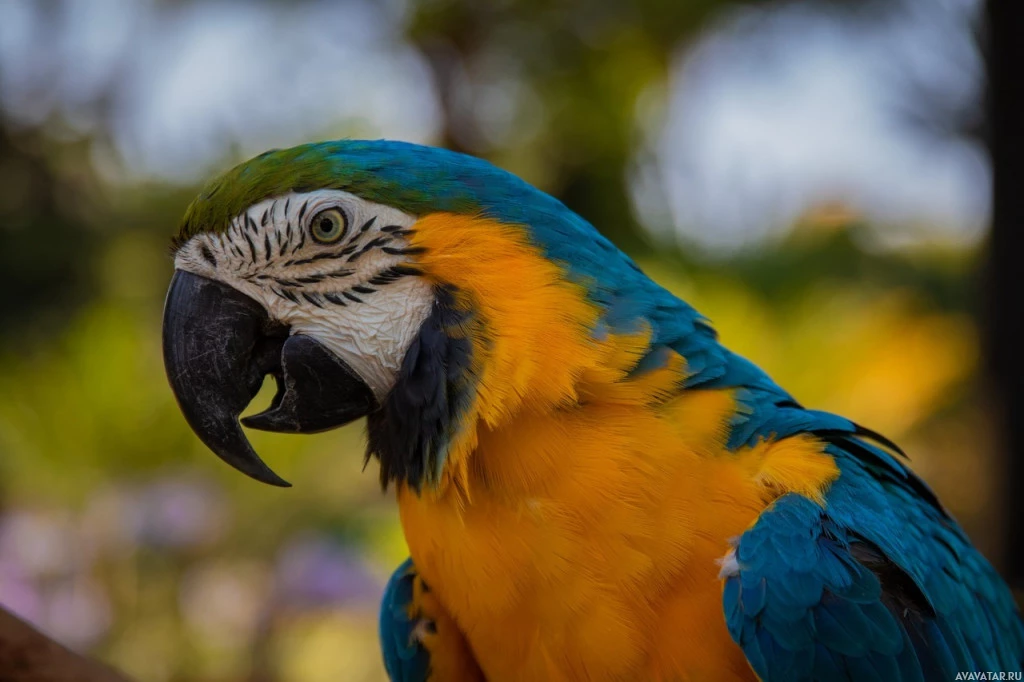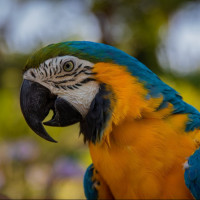 an outdoor setting with natural lighting, possibly in a park or aviary, as there are trees in the background and it seems to be enjoying the day. The bird's vivid colors contrast nicely against the more