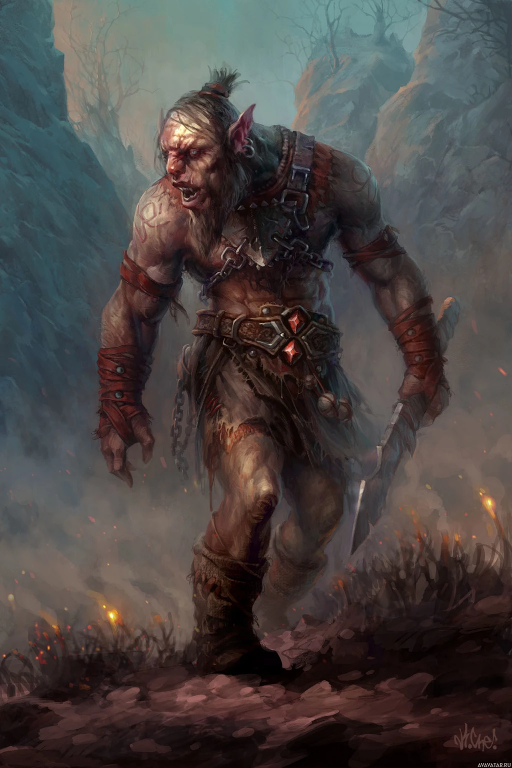 a fantasy scene featuring an orc. The orc is portrayed with