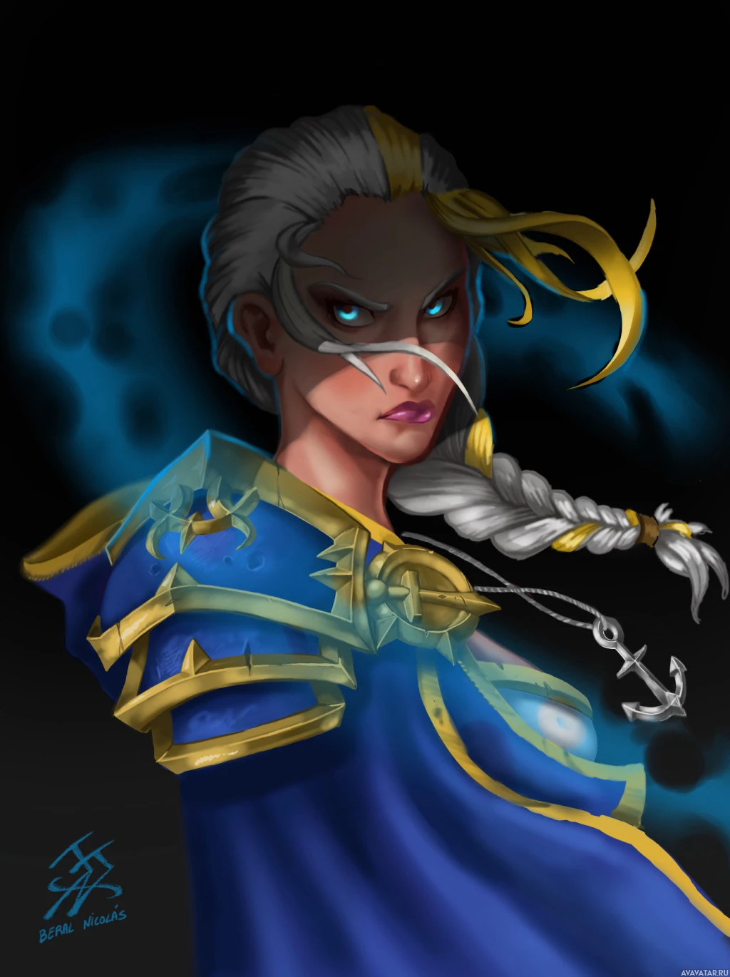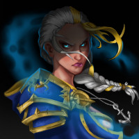 gold accents, which are typical of her appearance in the game. Her hair is styled into braids and she has