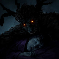 glowing eyes and sharp teeth, suggesting it might be a malevolent entity from a supernatural realm. The environment appears dark, possibly indicative of nighttime or a dimly lit setting, which enhances