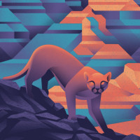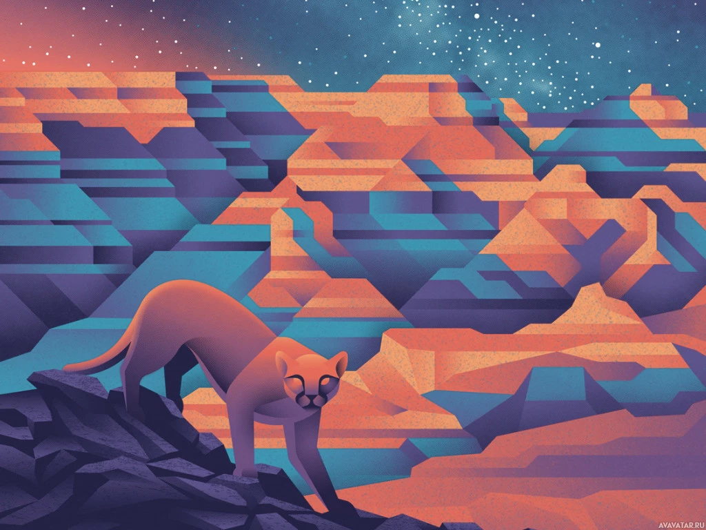 bright colors, likely inspired by the mesmerizing landscapes of the American Southwest or similar environments where pumas are found. The landscape is rocky with canyons and mountains under a starry