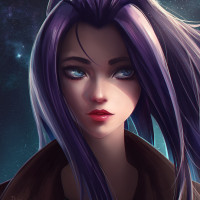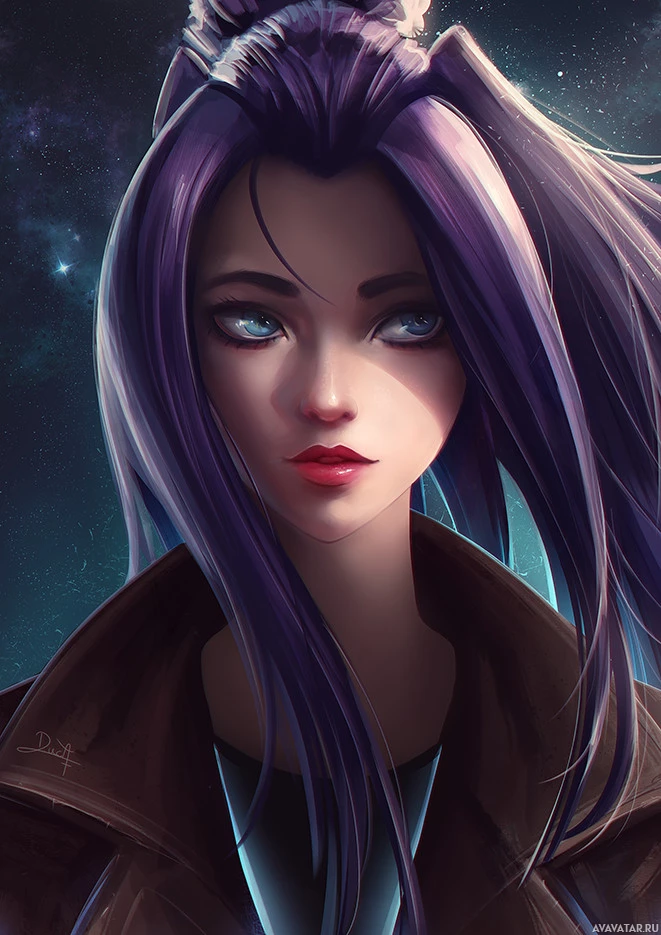На картинке изображен иллюстрированный персонаж, девушка с фиолетовыми волосами. Она имеет выразительное лицо и носит то, что кажется курткой или пальто, предлагая прохладную или формальную обстановку. Фон намекает на космическую или астрономическую тему, возможно, указывая на то, что она находится в футуристической или космической среде.