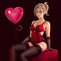 red balloon with hearts. Her pose suggests she might be holding the balloon's string. The setting has
