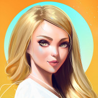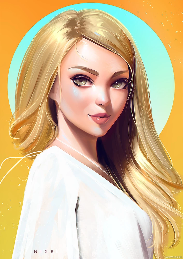 a female character with blonde hair and striking eyes. She is wearing a light-colored garment, possibly a shirt or top, that appears to be loose-fitting and translucent in