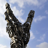 The image shows a robotic hand made of metallic parts with mechanical elements, giving it a futuristic and robotic appearance. It is designed to resemble the human hand in its structure but with a more mechanical look. The background suggests an outdoor setting under a cloudy sky, which adds contrast to the artificial nature of the robotic hand.
