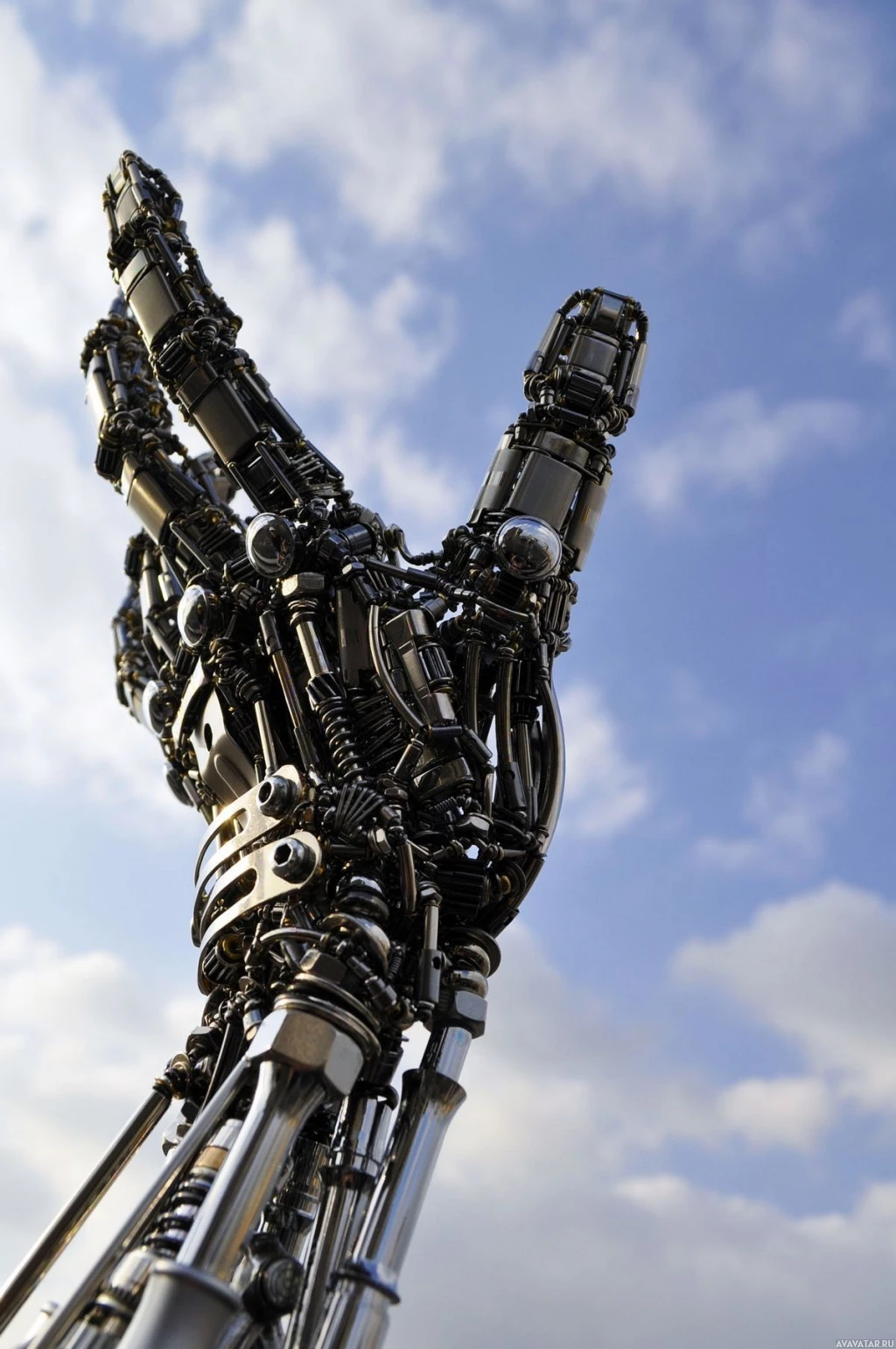 На картинке изображена роботизированная рука из металлических деталей с механическими элементами, придающая ей футуристический и роботизированный вид. Он разработан, чтобы напоминать человеческую руку по своей структуре, но с более механическим видом. Фон предполагает наружную обстановку под облачным небом, что добавляет контраста искусственной природе роботизированной руки.