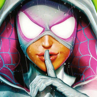 Gwen Stacy, a character from the Spider-Man comics. She is depicted with her hair pulled back and wearing a suit with