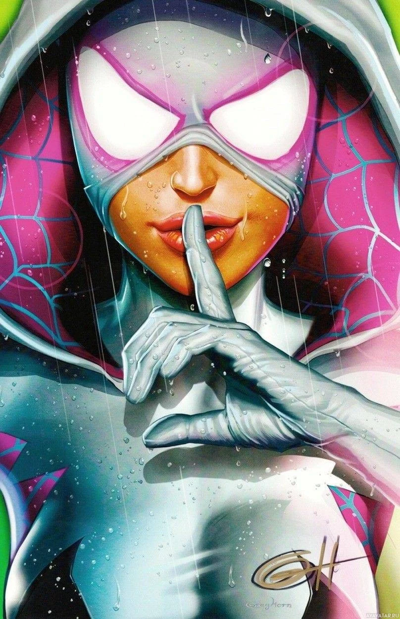 a spider emblem on her chest, which is characteristic of her superhero identity. In one hand, she is holding up her
