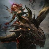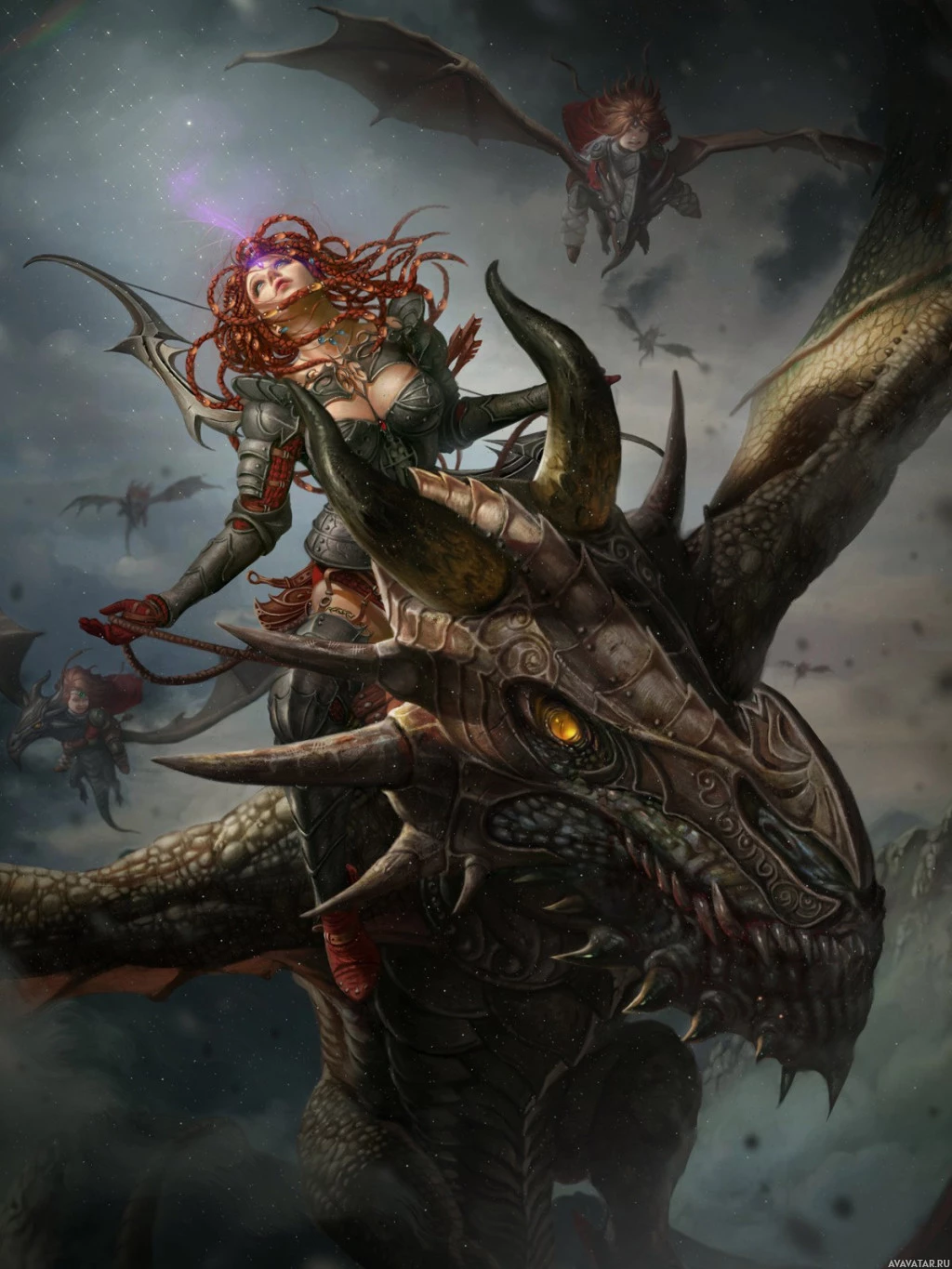 a fantasy dragon. She appears to be in motion, possibly depicted in mid-flight, which adds a dynamic element to the scene. Both characters are styled with an attention to detail that suggests they may be from