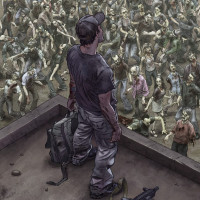 a dramatic scene where a man is standing on a rooftop or elevated platform surrounded by a large crowd of people. It appears that the crowd consists of individuals who are infected with a virus, possibly causing them to behave in an aggressive and violent manner, commonly associated with zombie-like behavior. The central figure seems to be observing the chaos below, possibly contemplating his next course of action or reflecting on