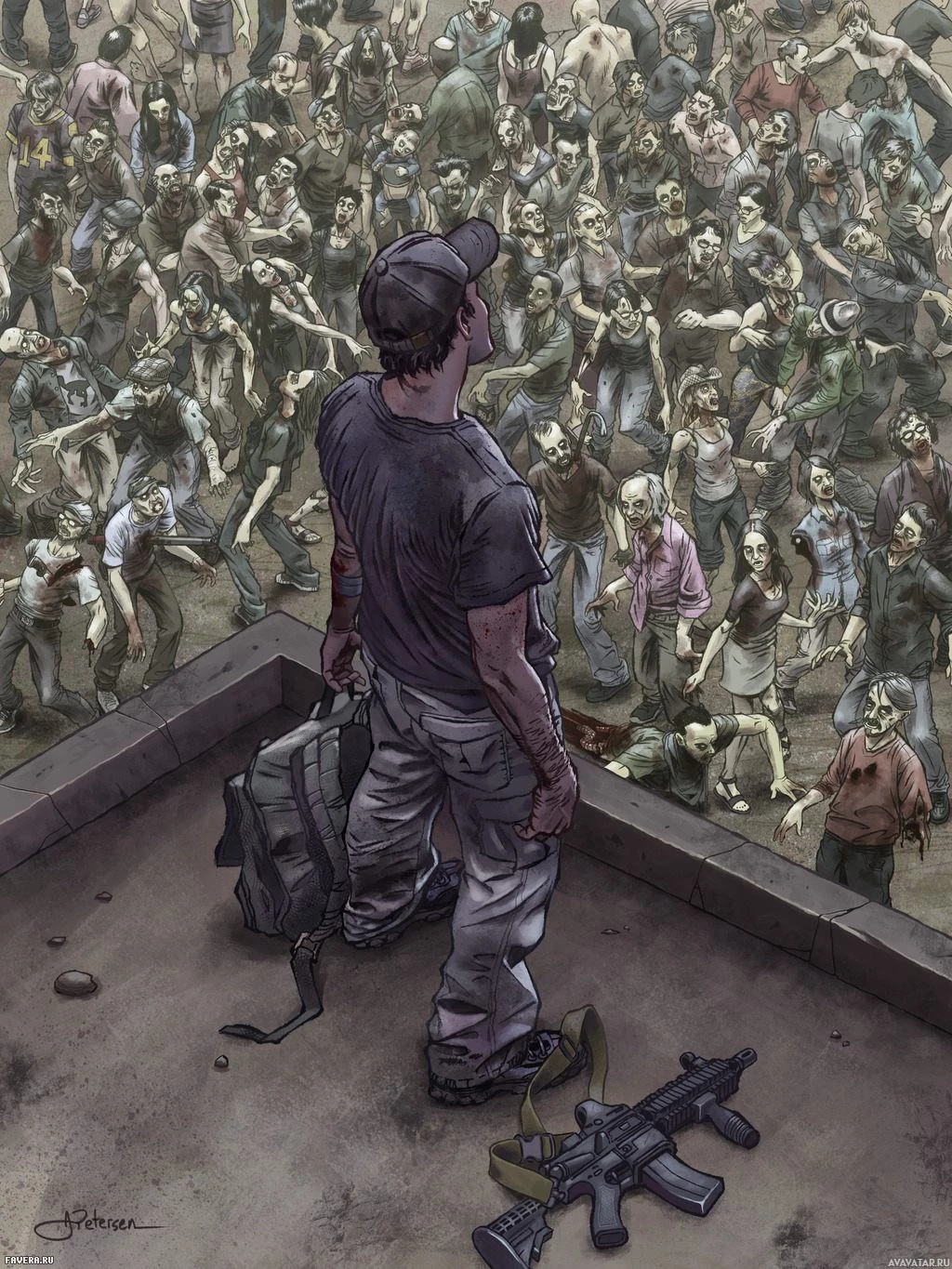 a safe distance from them. The image conveys a sense of tension and survival instinct, which are common themes in depictions of zombie outbreaks or pandemics.