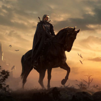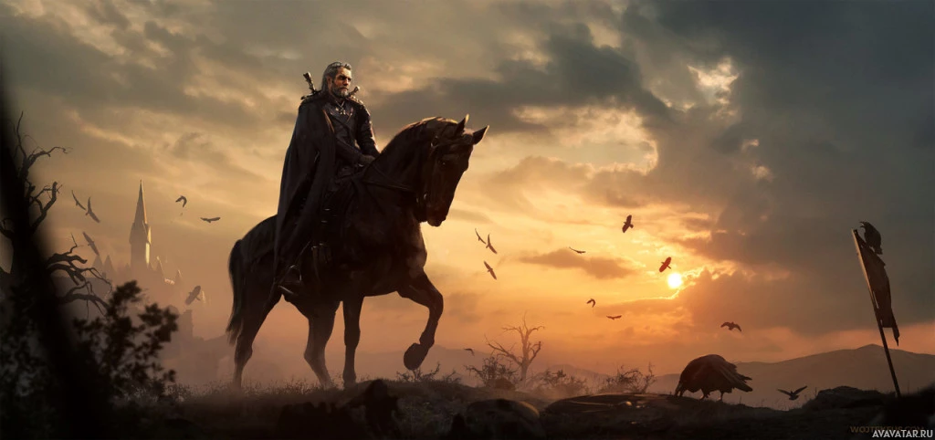 Geralt of Rivia, a central character in the game. He is shown on horseback at what appears to be either sunrise or sunset, given the warm light and silhouette-like figures in the background that might represent characters or creatures from the game's