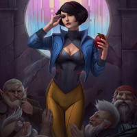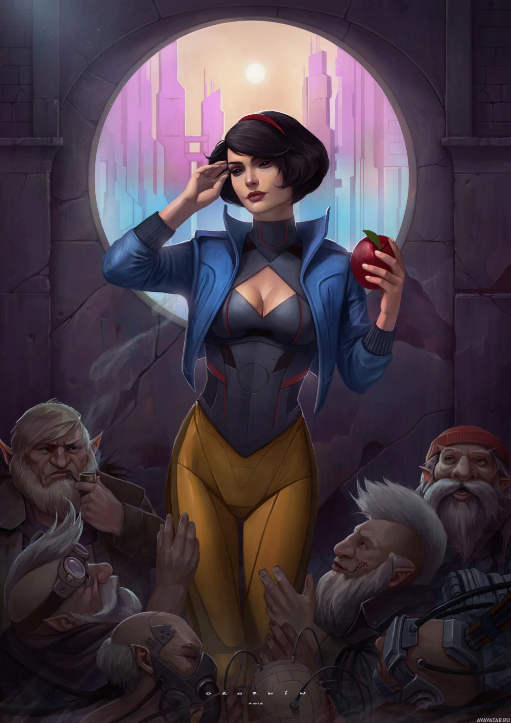 an illustrated character who appears to be a female with short hair, wearing a blue and yellow outfit. She is holding an apple in her hand and is looking upwards towards the sky or a window above her. Below her, there are