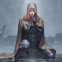 a hooded cloak that obscures her face. The setting seems to be an apocalyptic or post-apocalyptic environment with ruins in the background, suggesting