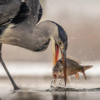 The image shows a large bird, likely an egret or similar species, in the act of catching and consuming a small fish. This scene captures the interaction between wildlife, specifically a predatory bird feeding on a smaller aquatic creature.