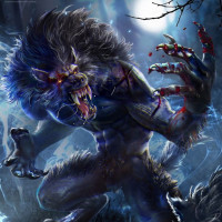 The image depicts a fantastical, werewolf-themed creature in a dynamic and intense pose. The creature has wolf-like features with