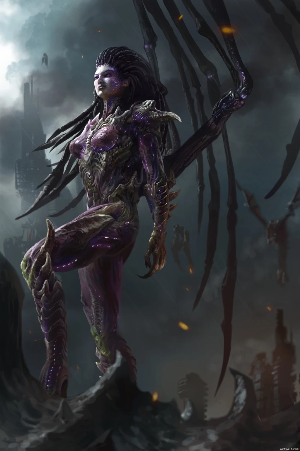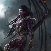 iconic role as the Zerg Queen and later as the Protoss heroine named Tassadar or other similar names depending on her form within the game's storyline. She is depicted with purple armor and has distinctive