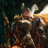 blonde hair and is holding a sword with her right hand while standing over flames, possibly indicating she's either in the midst of battle or about to embark on an adventure. The character is depicted with