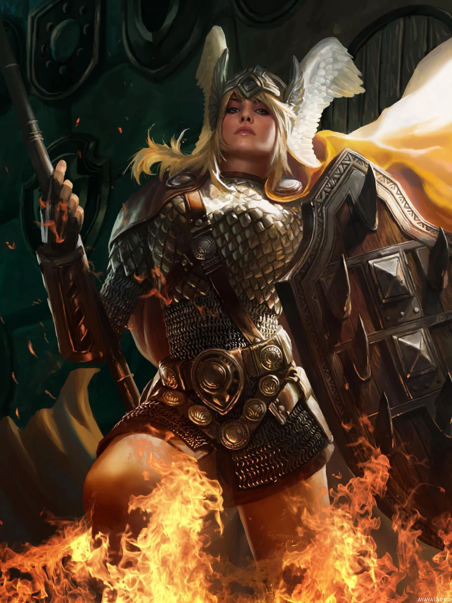 a female character who appears to be a warrior or adventurer, dressed in armor that resembles ancient Norse attire. She has long
