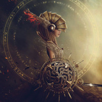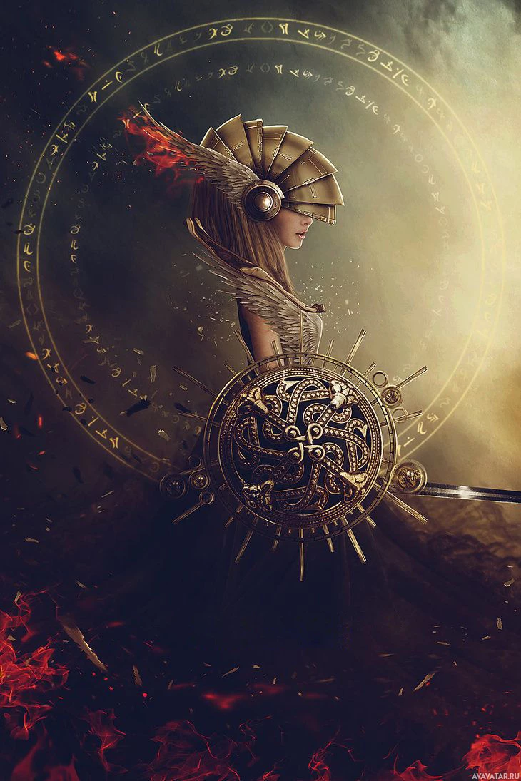 intricate designs on it. Behind her, there are flames and