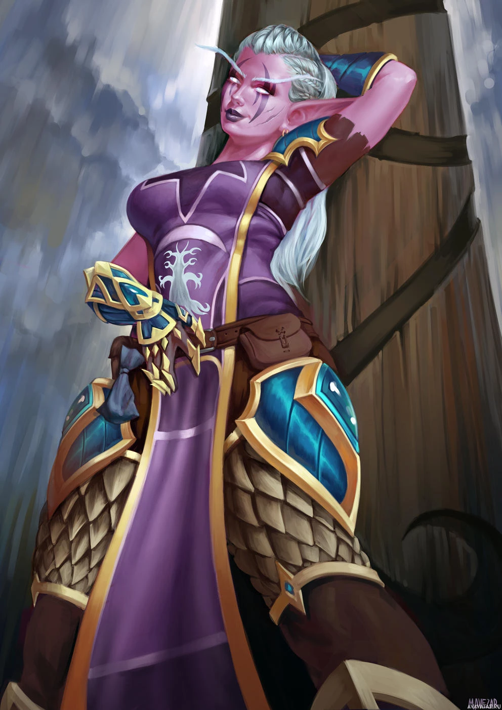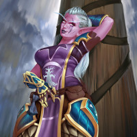a fantasy character that appears to be from the "Warcraft" franchise, dressed in armor and holding a weapon. She has