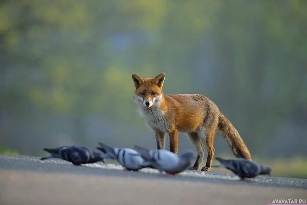 different species, as their sizes vary from smaller ones near the fox to larger ones further away. The picture captures an interaction between wildlife and nature, with the fox and the birds coexisting in the same environment.