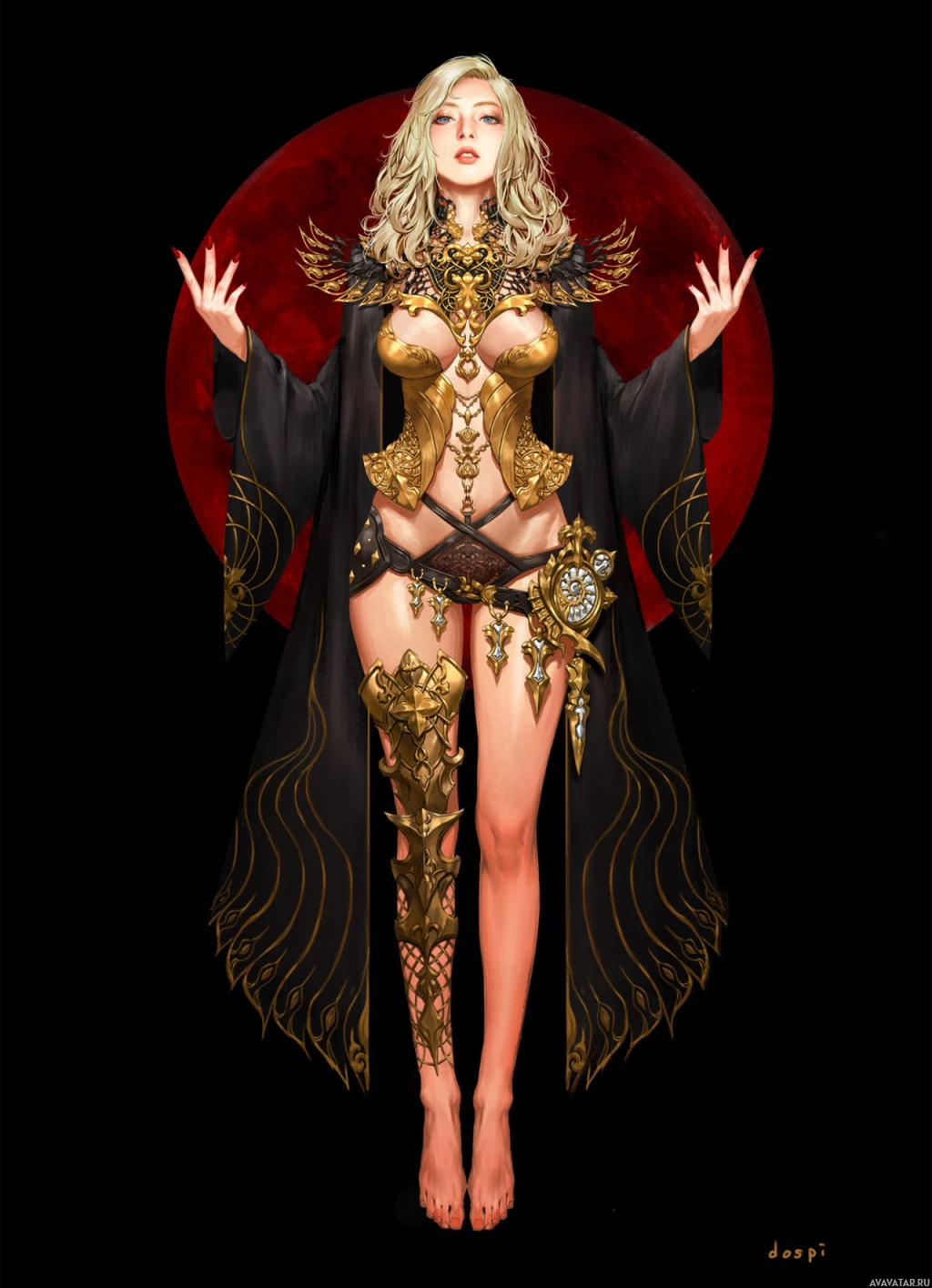 a fantasy setting. Her pose is dynamic and confident, with one hand extended as if casting a spell or making an important gesture. The background consists of a circular red and black motif that might symbolize a moon or