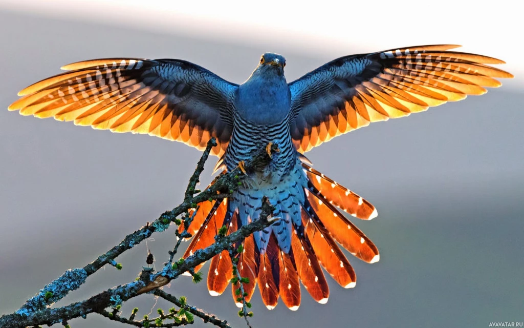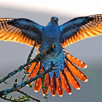 a colorful plumage, specifically with iridescent blue and yellow feathers. The bird is perched on a branch or twig, with its wings fully spread out, displaying the full extent of their size and coloration. It appears to be either in flight or preparing for flight. This could potentially be an example of a species known for their