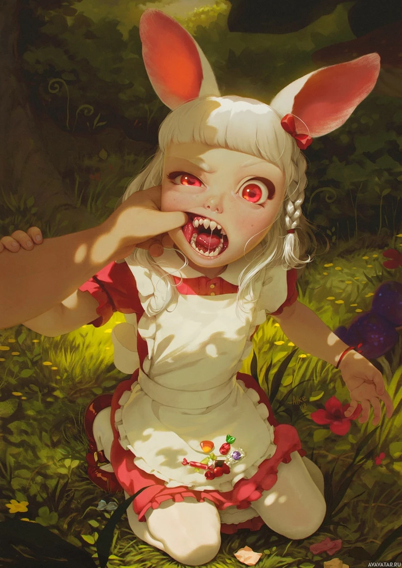 a pale complexion, and her expression seems somewhat distressed or scared. Her hair is blonde with white bangs, and she's wearing what looks like a traditional red and white outfit with a collared shirt and an apron, which might suggest that she is depicted in a fantasy setting often associated with whimsical stories or