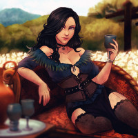 a fantasy setting, wearing an outfit that includes armor pieces and decorative elements indicative of her role as a witcher, which is a type of monster hunter. The character is seated with one leg crossed over the other while holding a glass, suggesting a relaxed or contemplative moment. The background features a forest-like setting, further enhancing