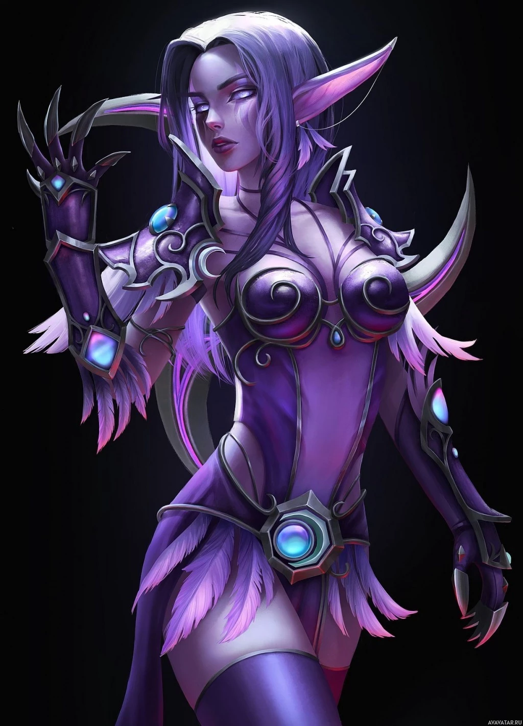 purple skin, pointed ears, and horns that suggest a demonic or mythical creature origin. Her attire consists of armor with