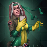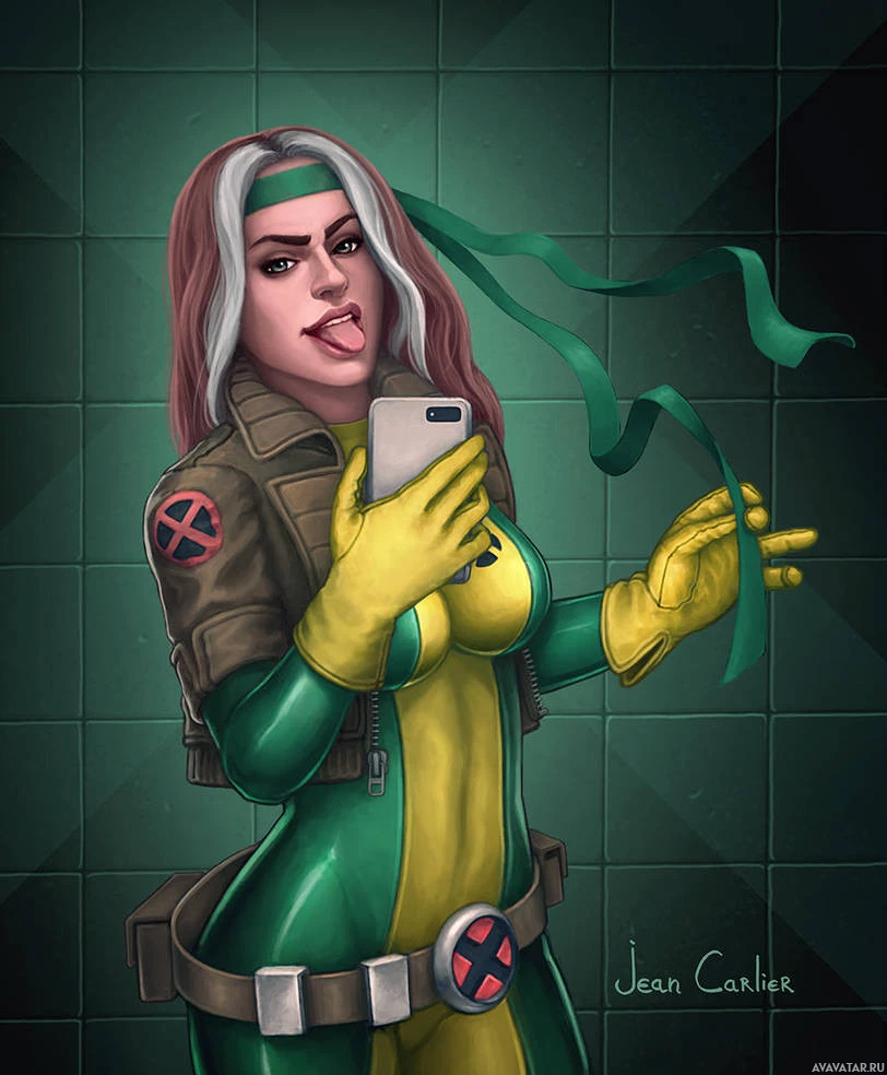 an illustrated character who appears to be inspired by Rogue from the X-Men comic books. She is styled with