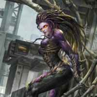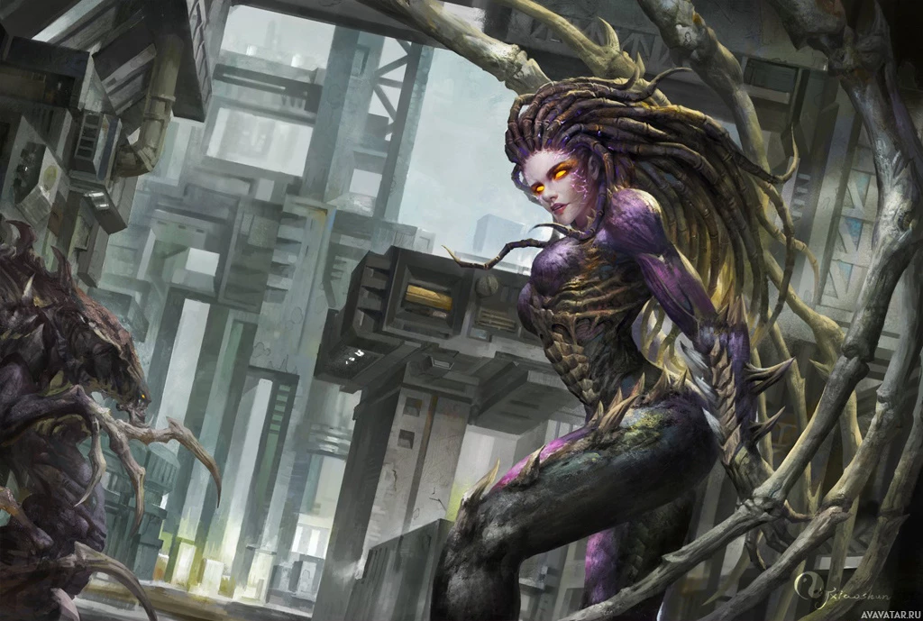 a fantasy scene featuring two characters that appear to be inspired by the game Starcraft. On the left, there is