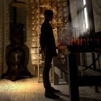 mechanical components and equipment visible in the background, such as pipes, gears, and what looks like a control panel or machinery. The lighting is subdued with some