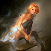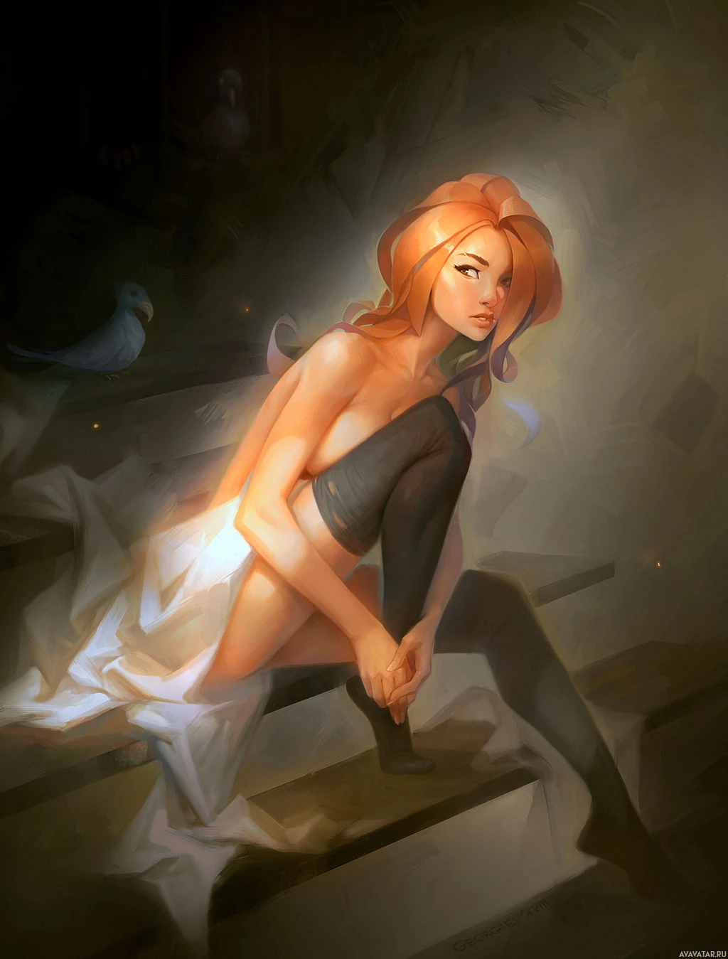 a black outfit with stockings and is holding something small, possibly a flower or a key, in her hand. There are also birds around her, suggesting