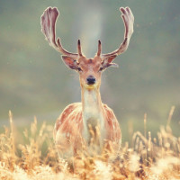 brown spots on its coat and antlers. It is looking directly at the camera, giving the impression that it is aware of being photographed. The background suggests