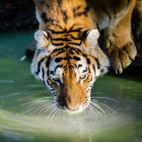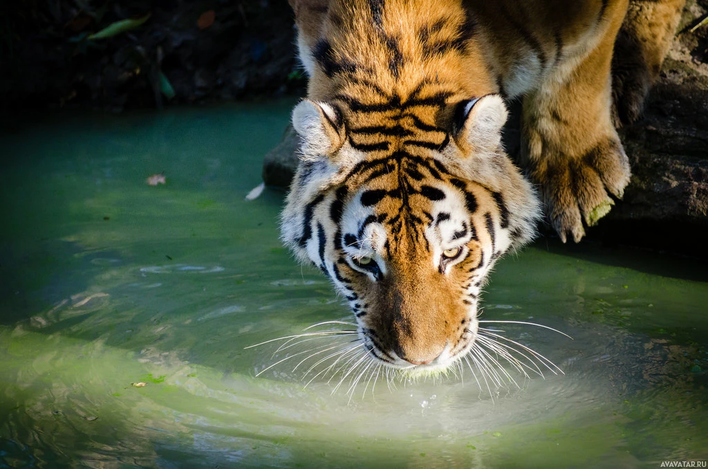 На картинке изображен тигр, наклонившийся над водоемом, вероятно, пьющий или исследующий его отражение. Это пример фотографии дикой природы, запечатлевшей поведение и естественную среду обитания животного.