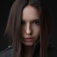 blur effect on the right side of the image, which adds depth and focuses attention on the subject. The background is neutral, allowing her to be the clear