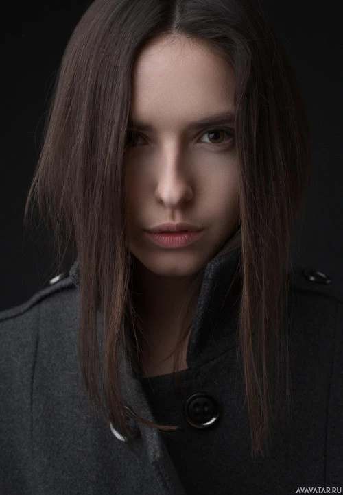 dark hair and is wearing a coat that appears to be made of a heavy fabric, possibly wool or a wool blend, given its texture and color. Her gaze is directed slightly off to the side, giving her