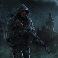 an illustrated scene with a character wearing a hood and carrying a weapon, which could be interpreted as a rifle or a gun. The character is walking towards the viewer, and there is