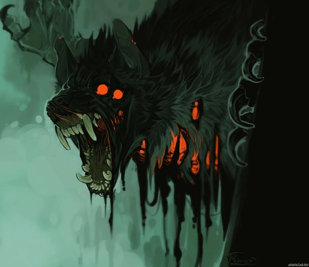 a fantastical creature that resembles a wolf with an eerie, ghostly appearance. It has red