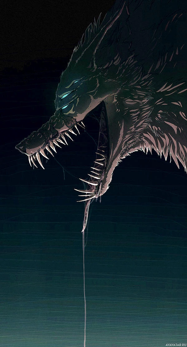 menacing creature that resembles a wolf or werewolf. The creature's mouth is wide open with
