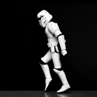 a black background which highlights the figure. The stormtrooper is standing on one leg, suggesting movement or action. This pose gives the impression of