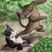 hind legs and seems to be striking the other, who is sitting with all fours on the ground. Both cats are depicted with detailed fur patterns, typical of the breeds they represent: one appears to be a Maine Coon due to its size and