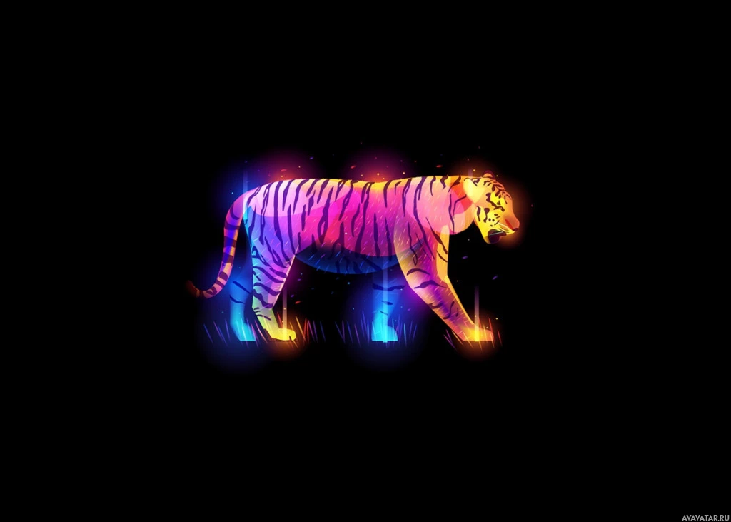 neon colors, giving it an electric and vibrant appearance. The background is dark, which contrasts with the brightly colored tiger, making it stand out prominently. This
