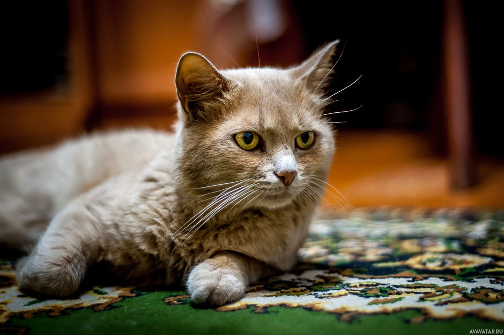 На снимке изображена кошка. Это похоже на внутреннюю обстановку, возможно, гостиную или прихожую. Кошка имеет пушистую шерсть и смотрит прямо в камеру сосредоточенным взглядом. Перед ним коврик и то, что выглядит как мебель на заднем плане.